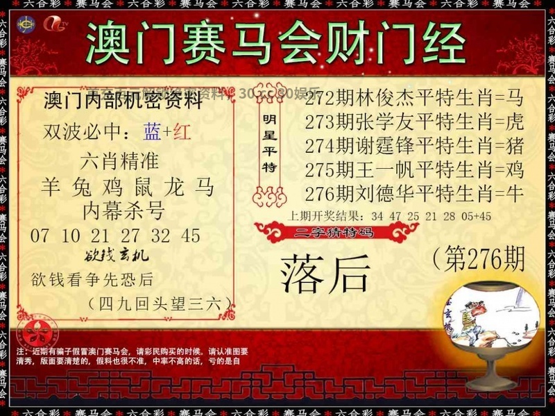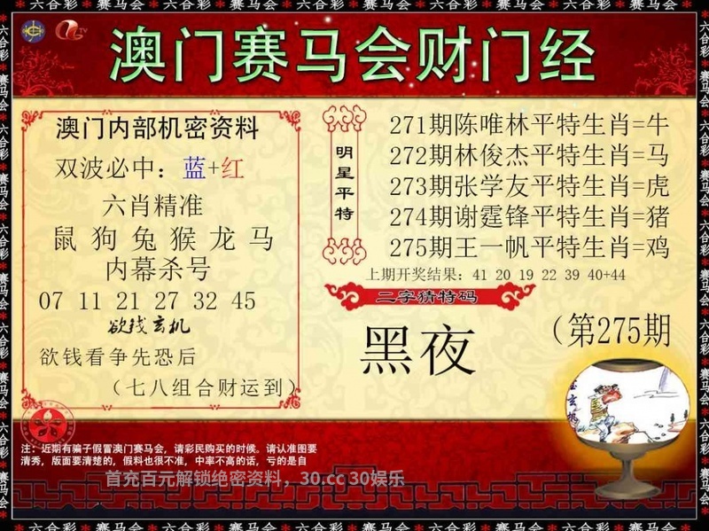 275期七肖 | 鸡马鼠虎狗龙猴 | 开:鸡45 |